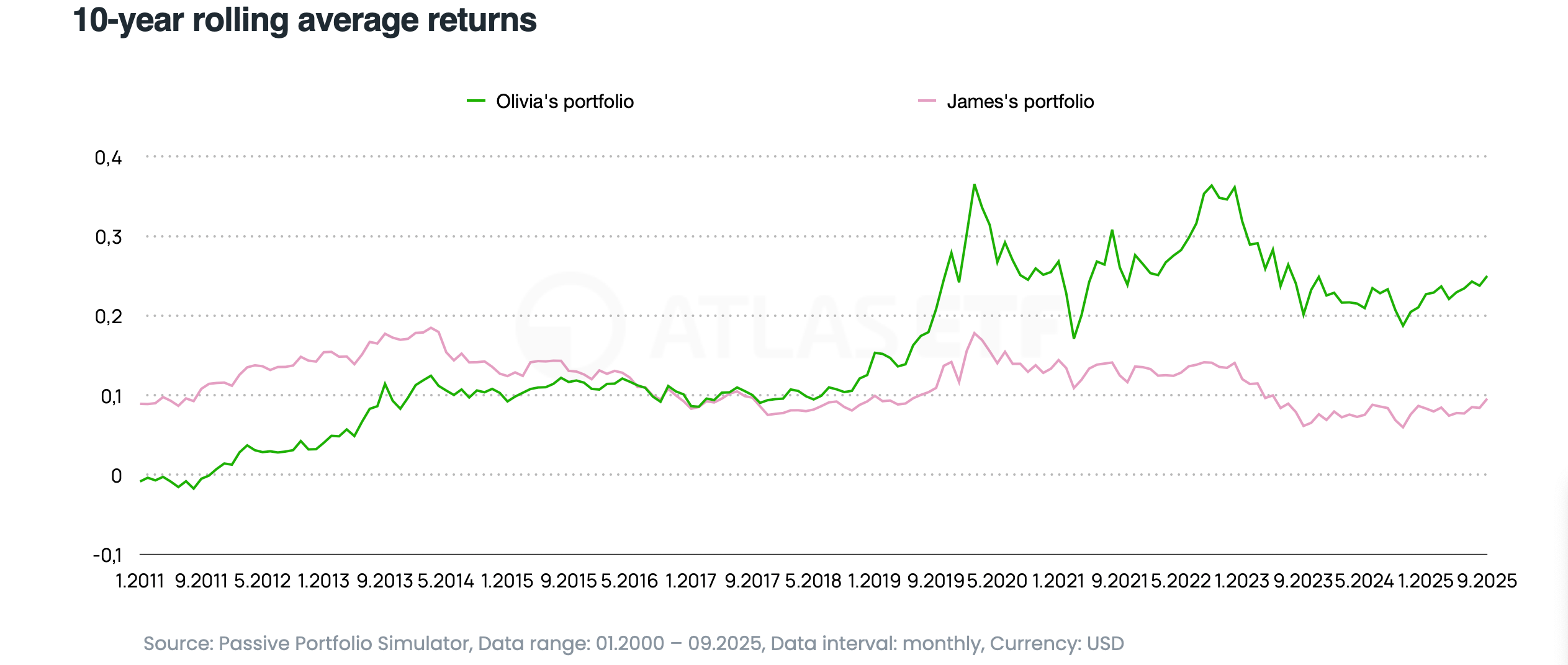 Let’s also look at the 10-year rolling average returns of the analyzed portfolios. Each point on the curve shows the average annual return an investor would have achieved if they’d invested 10 years earlier and held that strategy for the entire decade.