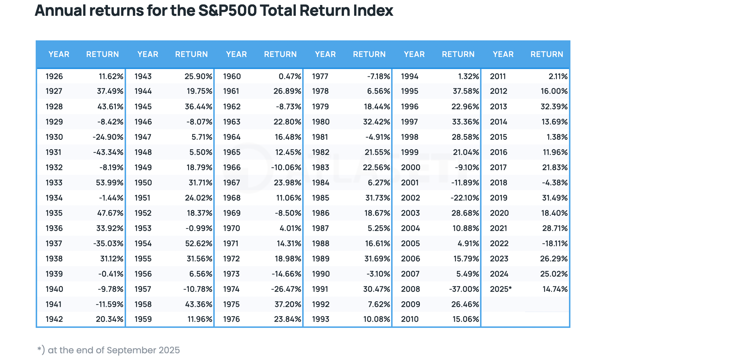 So, someone who “tried to outsmart the market” – buying bonds, defensive shares or even raw materials – might end up disappointed, seeing a simple S&P 500 ETF beating their portfolio. Below is a table of annual returns for the S&P 500 Total Return index.