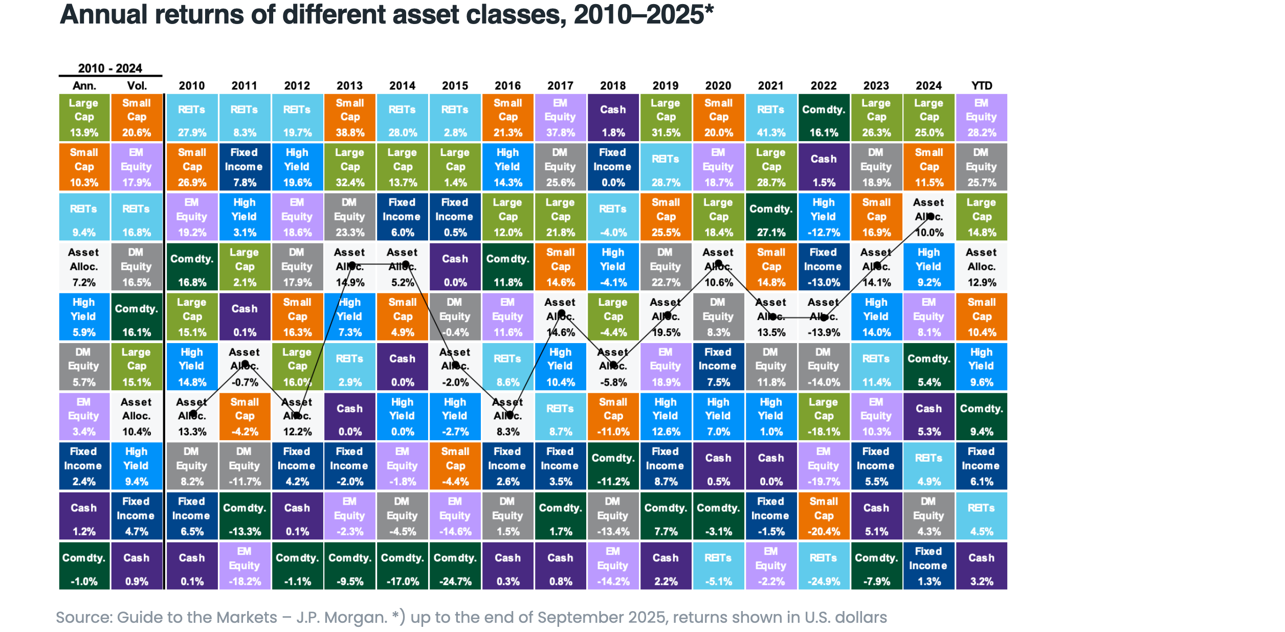 The chart below shows how different asset classes performed between 2010 and 2025. As you can see, the largest U.S. companies aren’t always at the top when it comes to returns.