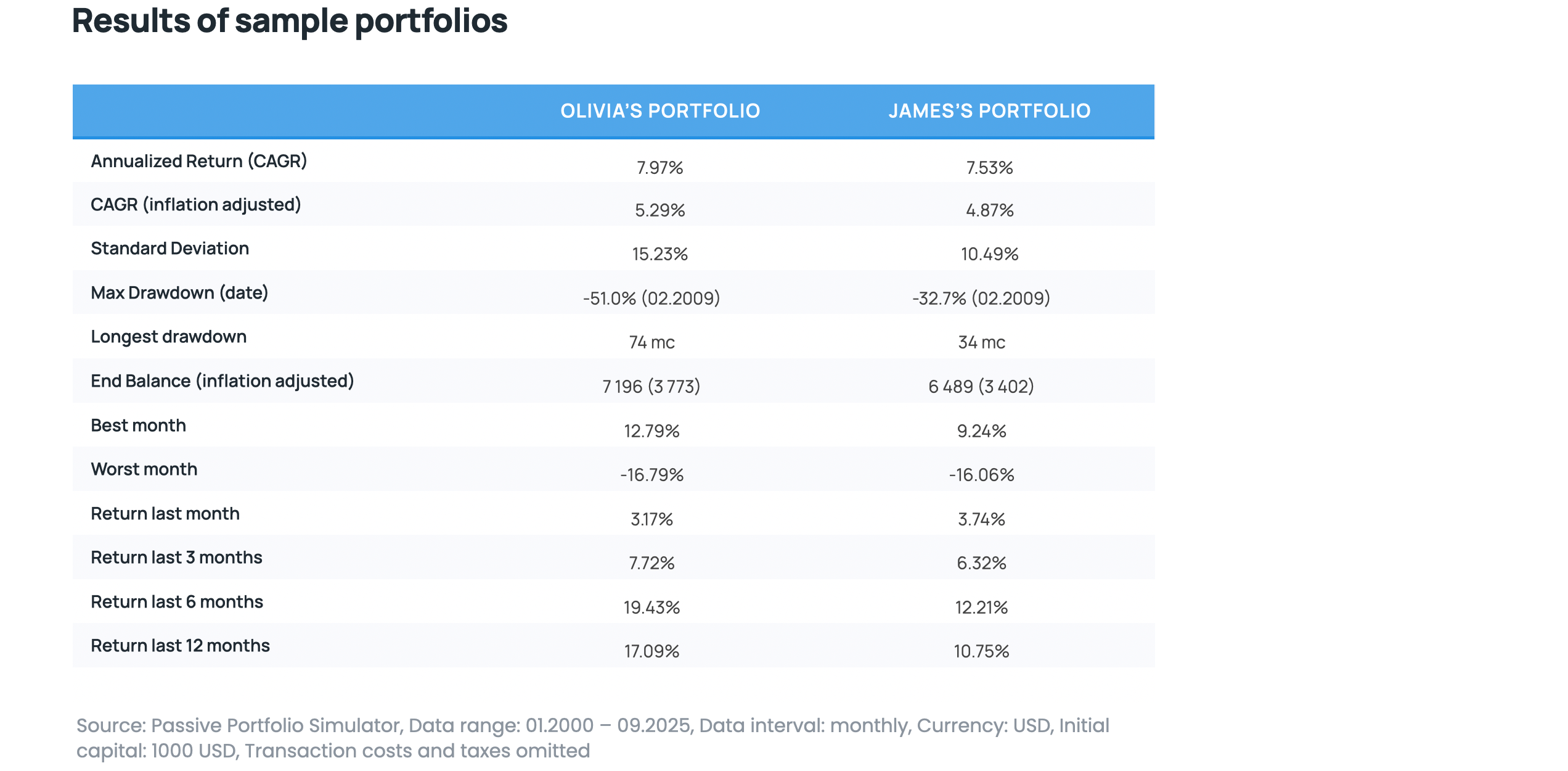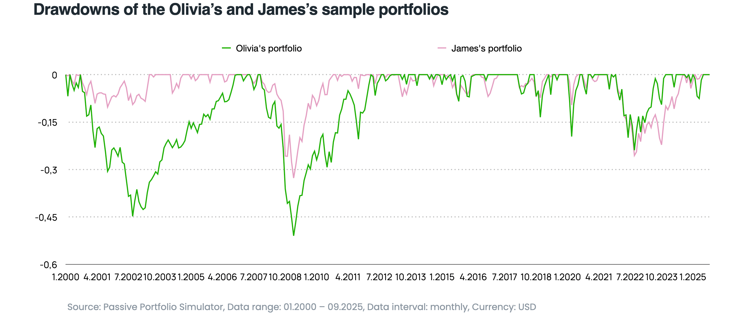 Below is a chart of the maximum drawdown for both portfolios. Olivia’s portfolio experienced significantly deeper drawdowns during almost every major market crisis. At the peak of the global financial crisis in 2008–2009, the drawdown exceeded -50%. By comparison, James’s portfolio lost around -33% in the same period. The drawdowns in James’s portfolio are noticeably shallower and shorter – even in tougher moments, the portfolio recovers much faster to its previous highs, and the psychological impact (enduring a bear market) is less severe.