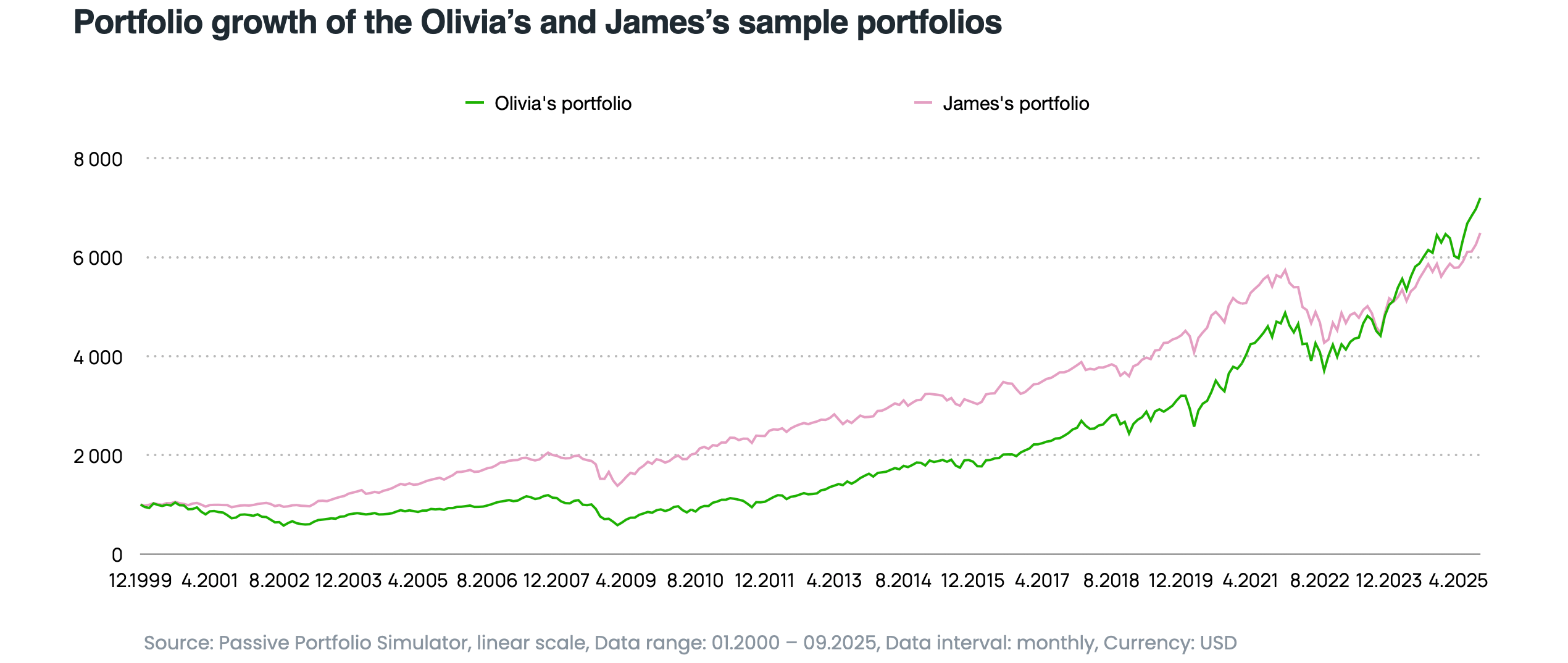 Over 25 years, Olivia will probably achieve a higher return if the USA stays the global growth leader. But James will experience much less volatility, and in times of crisis, his portfolio will fall only half as much.