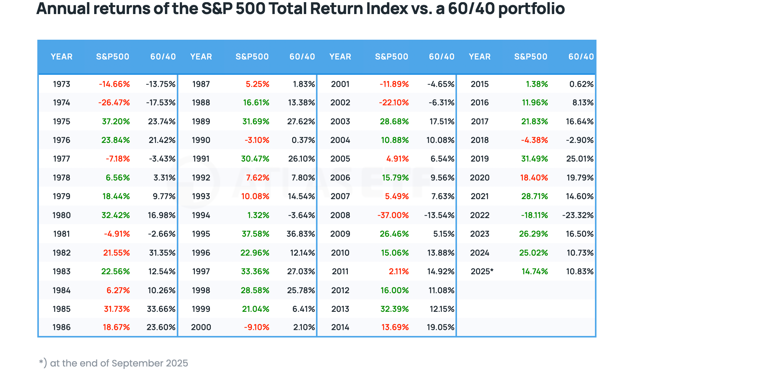 Below is a table comparing yearly returns for the S&P 500 Total Return index and a 60/40 portfolio. In the whole period shown, the S&P 500 did better 32 times in 52 years.