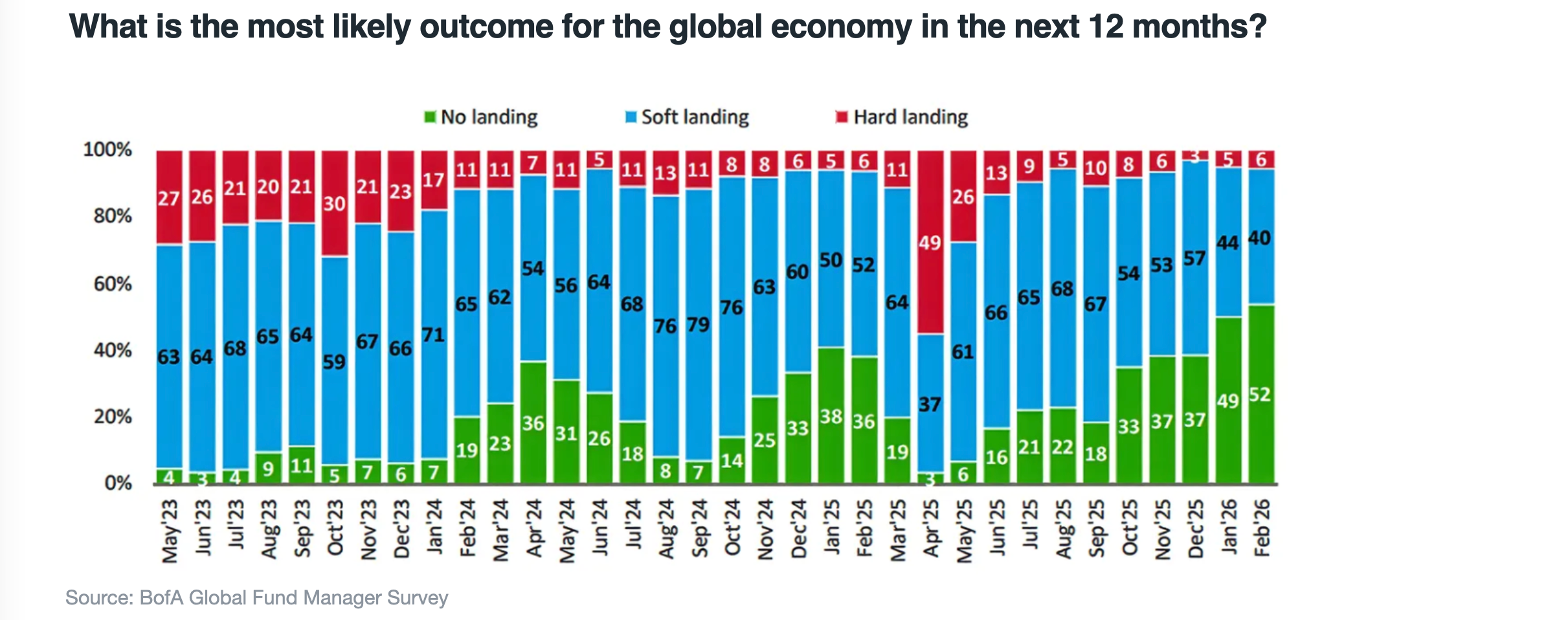 “No landing” is a scenario in which the US economy maintains above-trend growth without recession and without a meaningful cooling of inflation – neither a “hard landing” (recession) nor a classic “soft landing” (gradual deceleration). A record 52% of fund managers now treat this as their base case, while Bloomberg Consensus estimates US GDP growth at 2.4% for 2026, partly driven by AI-related investment.