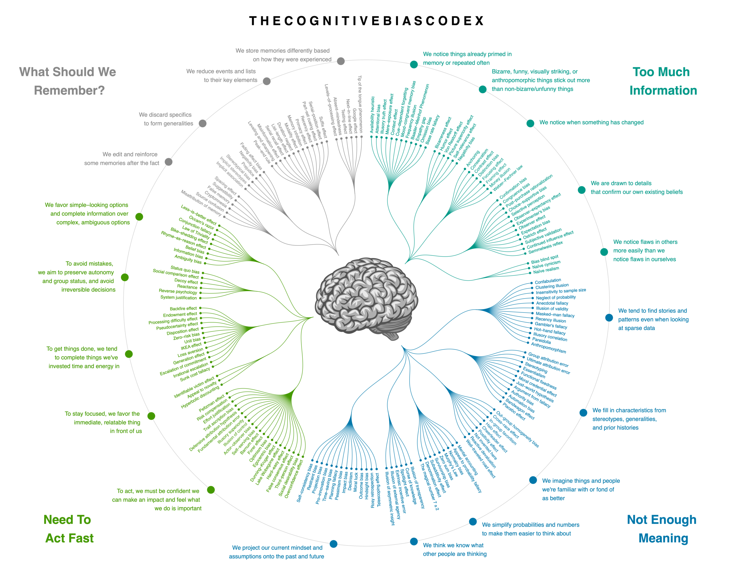 Figure 2. The Cognitive Bias Codex — Wikipedia’s list of cognitive biases arranged and designed as a radial diagram by John Manoogian III (jm3), based on the category model by Buster Benson; source: Wikimedia Commons (“Cognitive bias codex”).