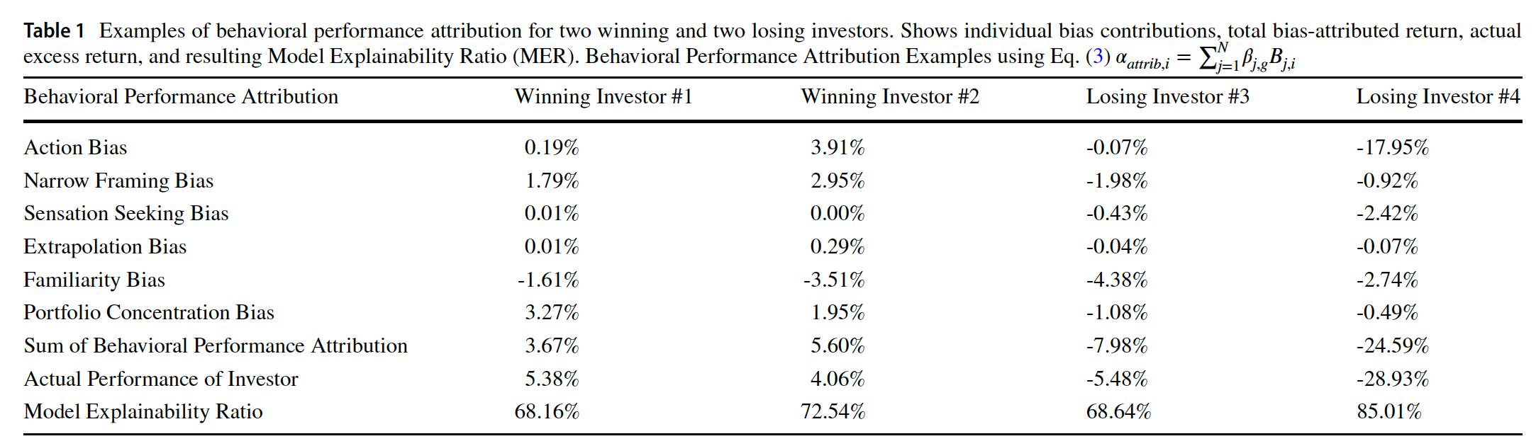 Table 2. Examples of behavioral performance attribution for two winning and two losing investors, showing individual bias contributions, total bias‑attributed return, actual excess return and the resulting Model Explainability Ratio (MER), based on Gorzon & von Nitzsch (2025).