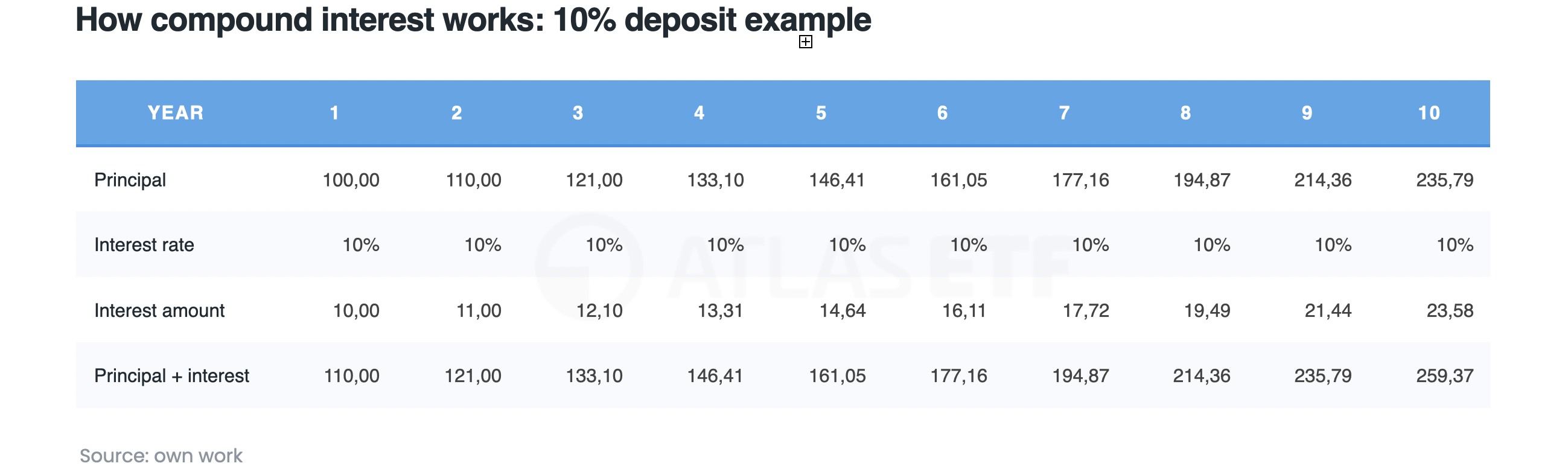 If the interest weren’t added to the capital, after 10 periods the investor would have 200 USD on the account (100 USD + 10×10%). However, with interest capitalization, the account will show 259.37 USD. This demonstrates the “magic” of compound interest.