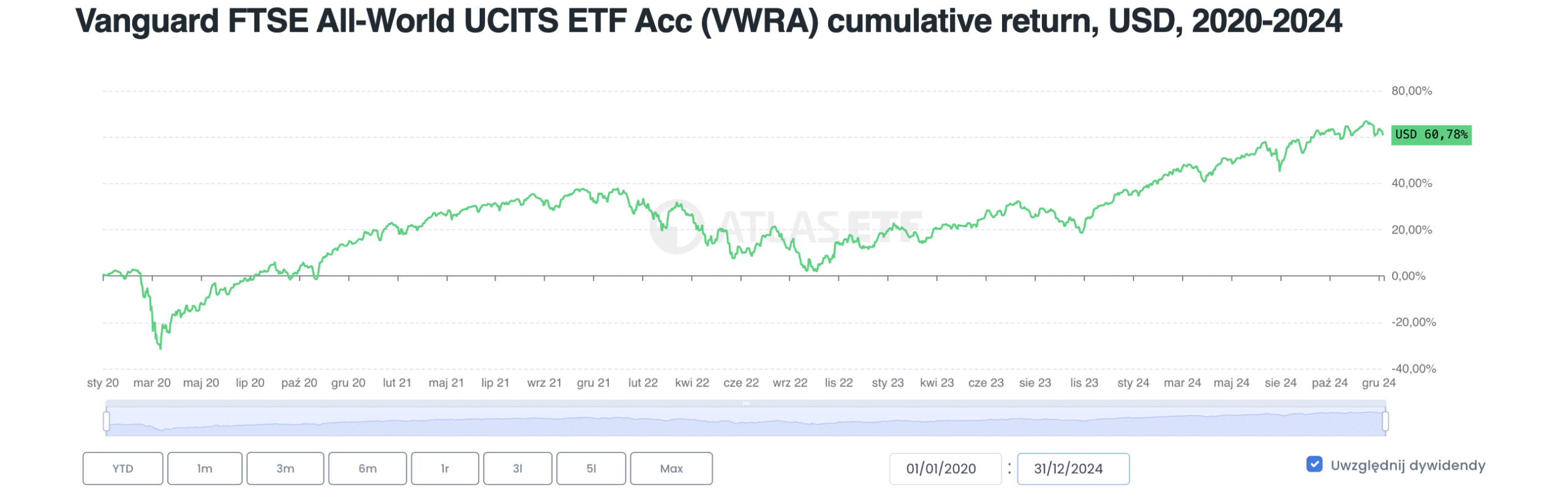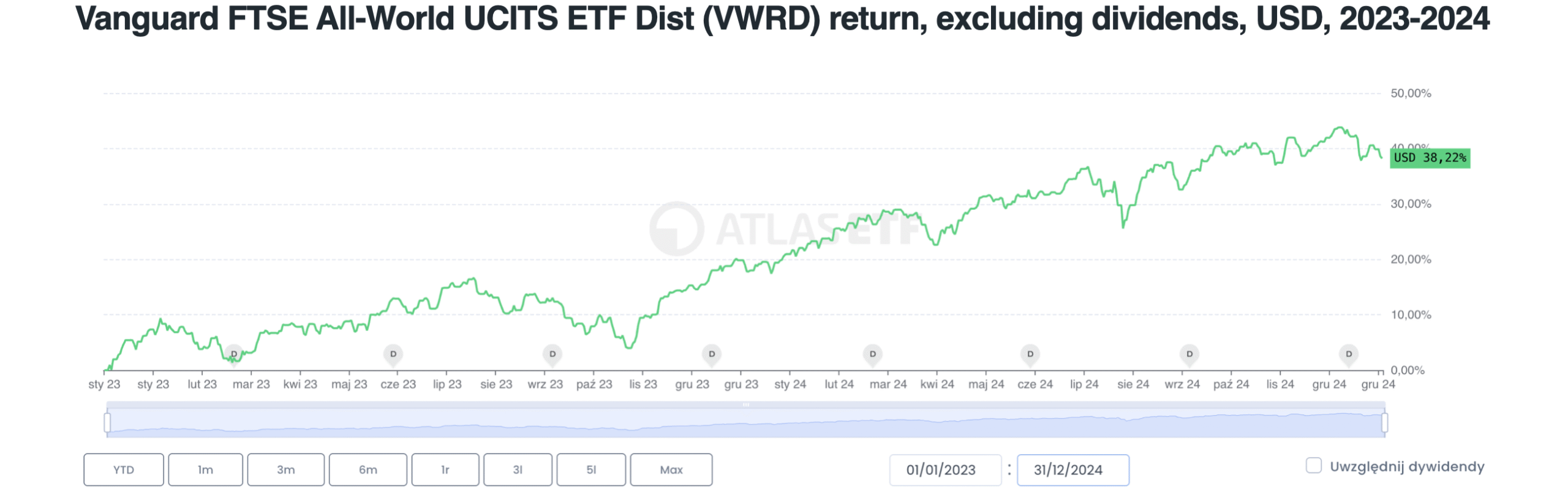For other non-working assets like cryptocurrencies (e.g., bitcoin), it works similarly. To verify this, visit atlasETF.pl, open the page for any instrument, go to the Chart tab, check returns for selected periods (e.g., annual), and compare them to the total return for the entire period (which you can read from the chart).