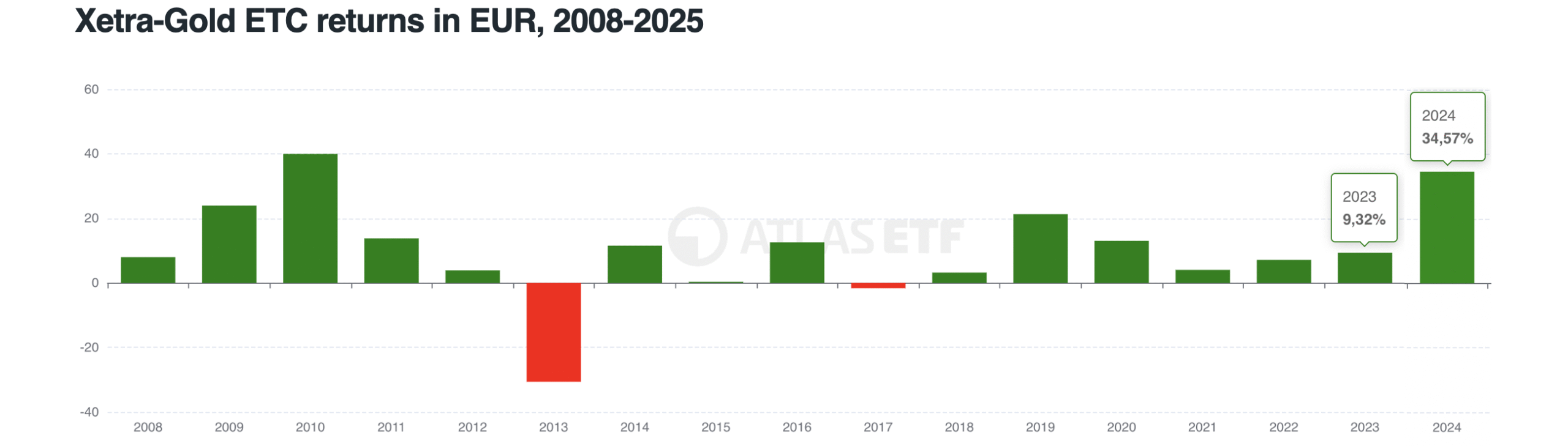 Yes—compound interest works here through reinvesting gains from price appreciation, even if it’s not immediately obvious. Example: Xetra-Gold ETC in 2023–2024 (in EUR) achieved returns of 9.32% and 34.57%. A simple sum would give 43.89%.