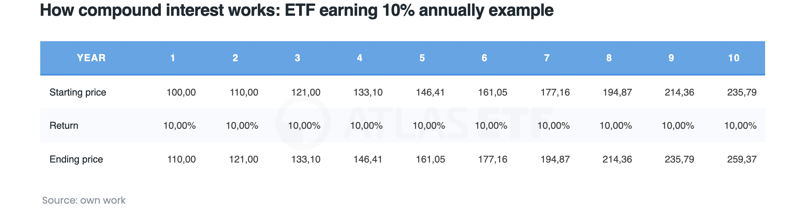 It’s worth illustrating with an example. Suppose an ETF earns 10% in the first year and another 10% in the second. The return after 2 years isn’t 20%, but 21%.