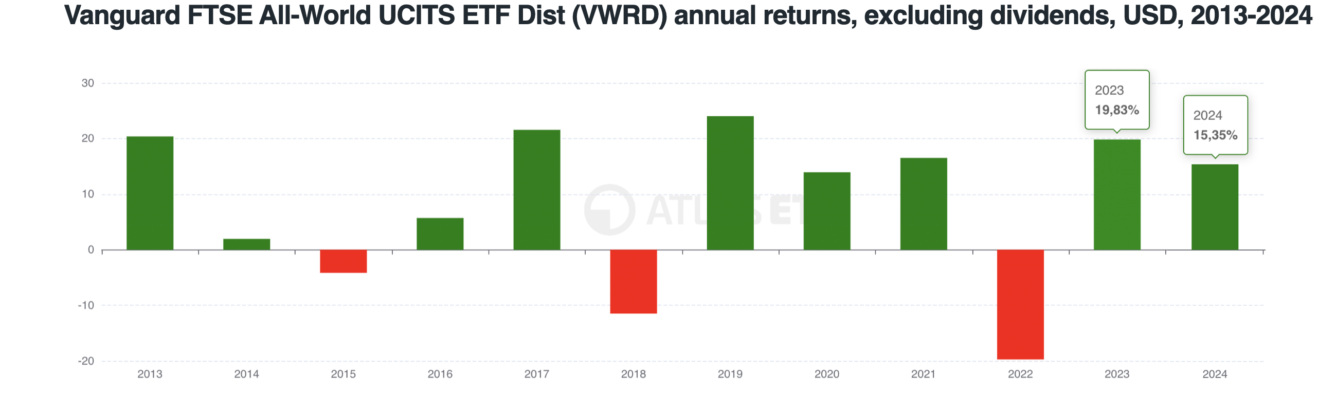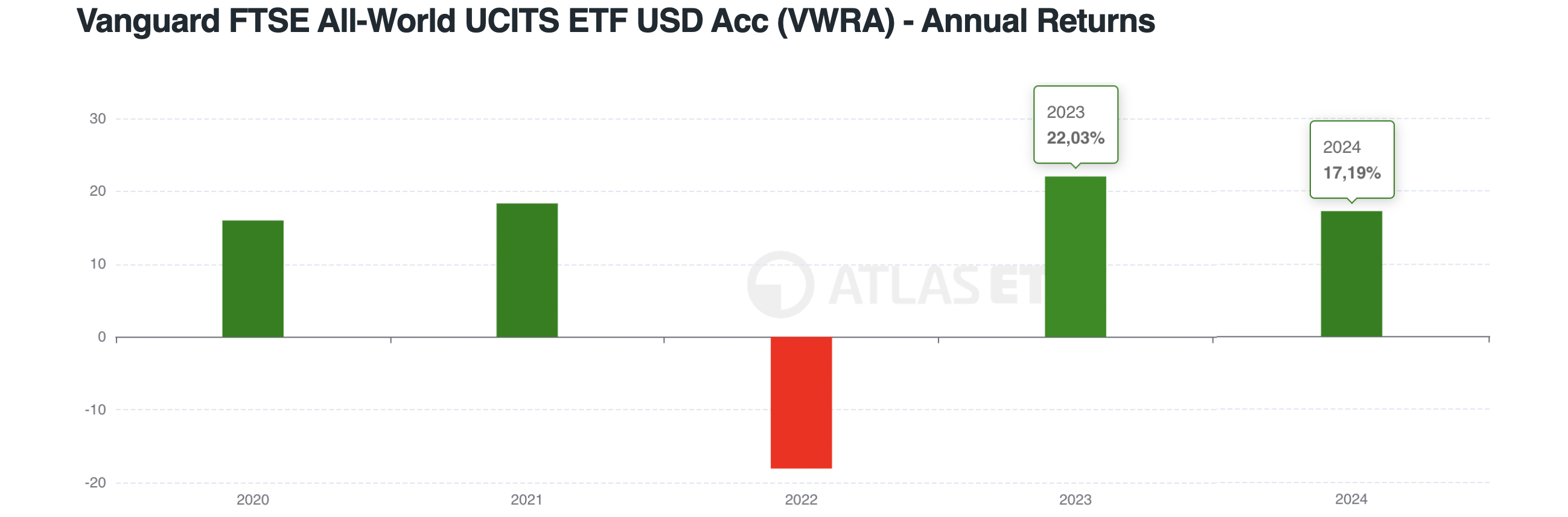 This is even clearer with the aforementioned Vanguard FTSE All World UCITS ETF Acc (VWRA). In 2020, 2021, 2023, and 2024, it posted gains (15.99%, 18.33%, 22.03%, 17.19%), and in 2022 a loss of -18.08%. A simple sum of the annual returns would be 55.46%, but that wouldn’t be the actual return achieved in that period.