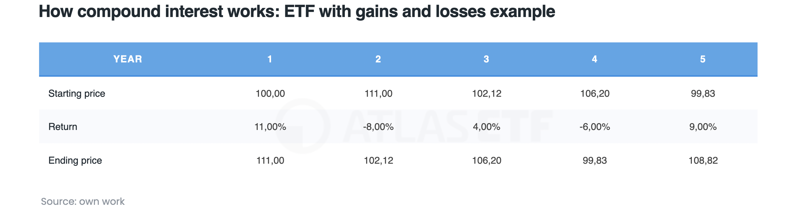 In practice, ETFs have both profitable and loss-making years, which further highlights the error of simply summing returns. Take a hypothetical fund with returns: +11%, -8%, +4%, -6%, +9%. The simple sum is 10%, but the actual return is 8.82% (ending price after 5 years is 108.82).