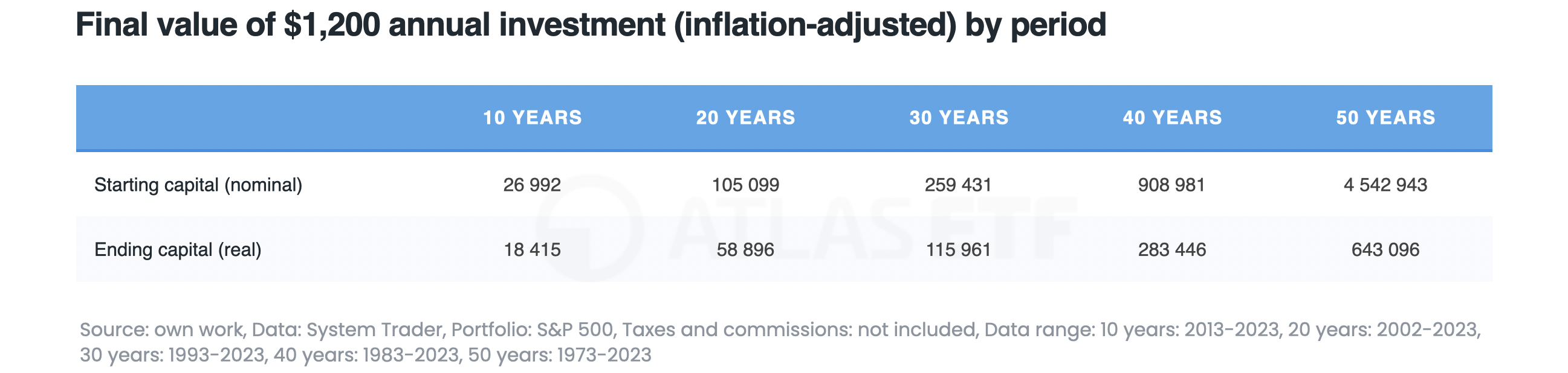 The final nominal amounts are impressive, but they ignore inflation, so it’s better to look at real amounts that account for it. After 10 years, $18,415 was accumulated (in real terms). After 30 years (3 times longer)—$115,961, or over 6 times more. After 50 years (5 times longer)—$643,096, or nearly 35 times more.