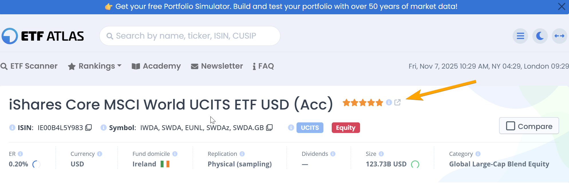 Many ETF research platforms, such as ETFatlas, provide star ratings for ETFs, typically on a scale from 1 to 5 stars (1 = lowest, 5 = highest).