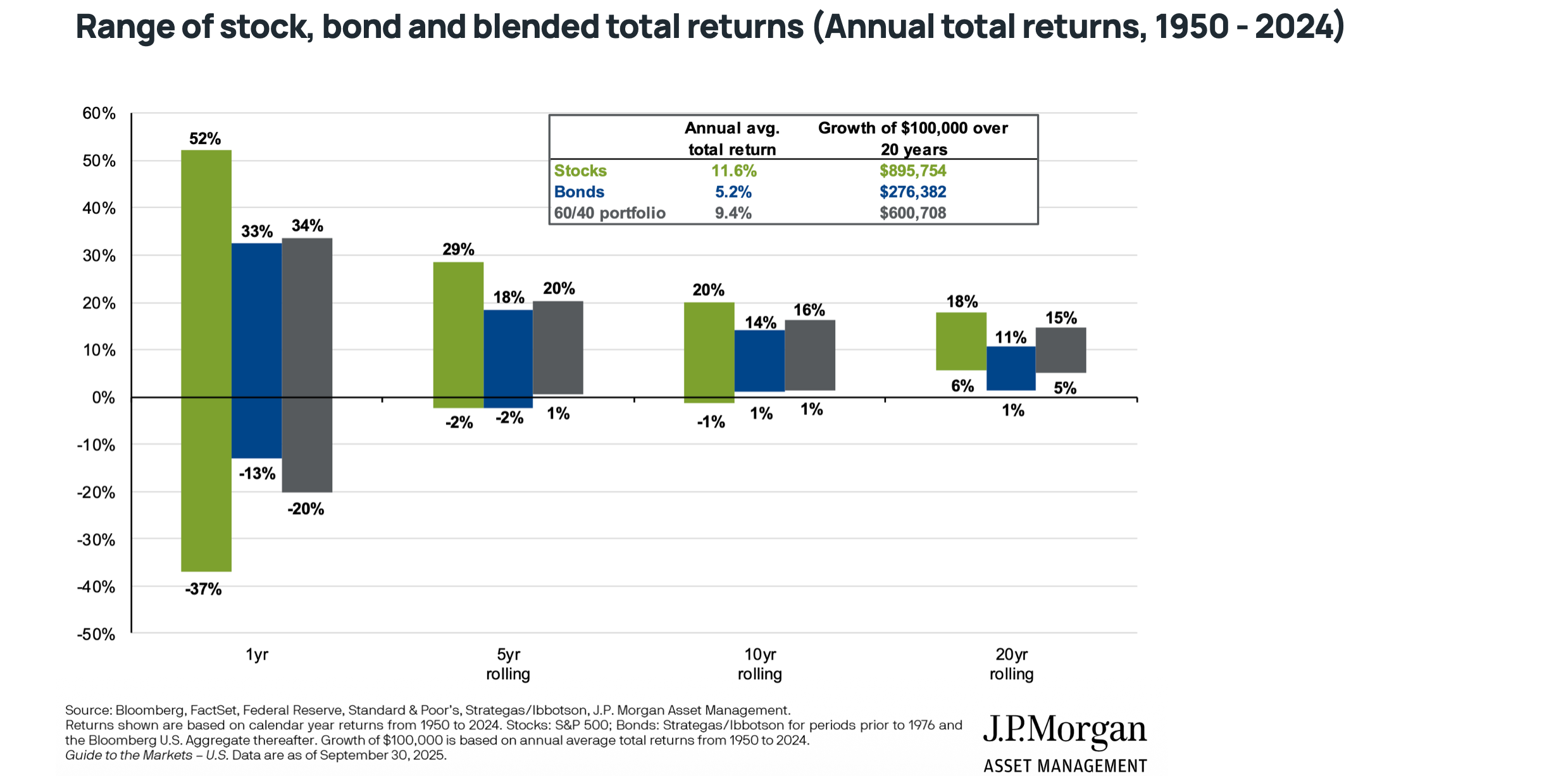 The chart below shows the dispersion of returns over a 1, 5, 10, and 20-year perspective for the US market. Conclusion: The longer you are in the market, the lower the risk of loss. In a 20-year perspective, historical data does not show a single period with a loss.